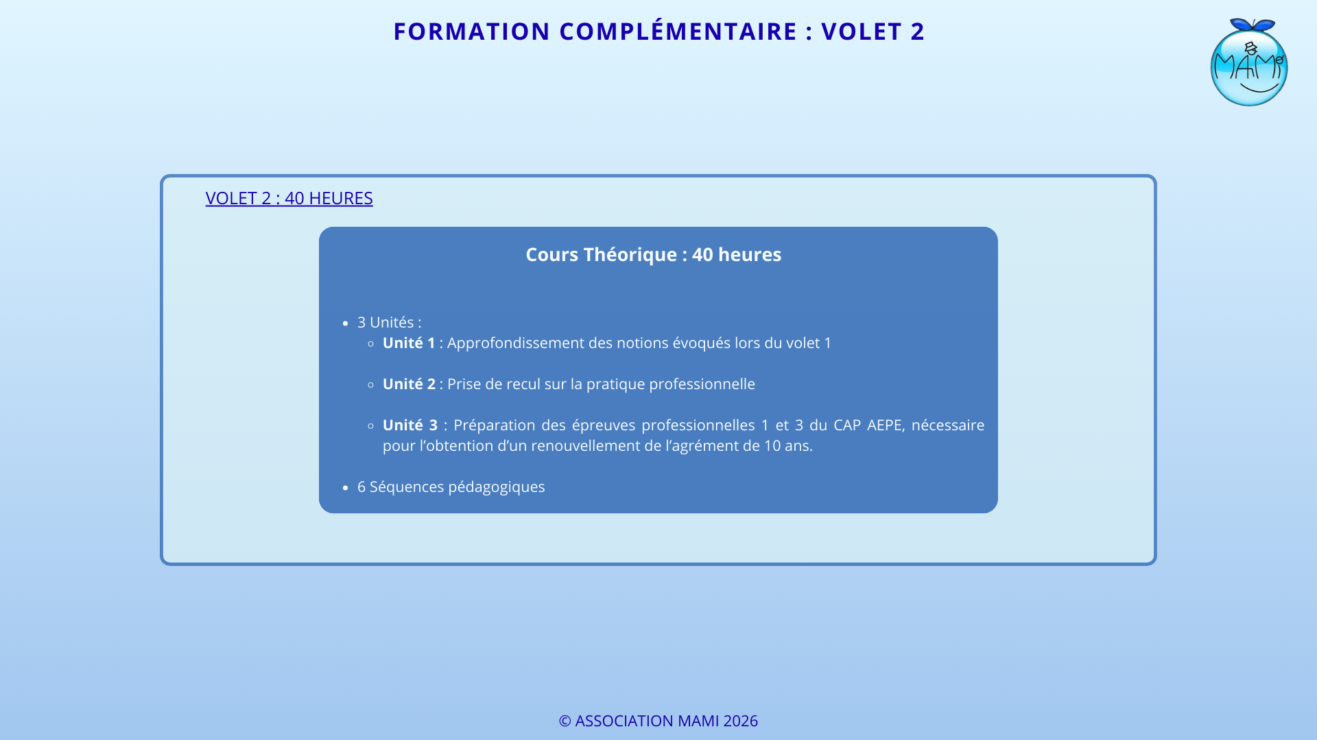 Volet 2 : Formation complémentaire de 40 heures :