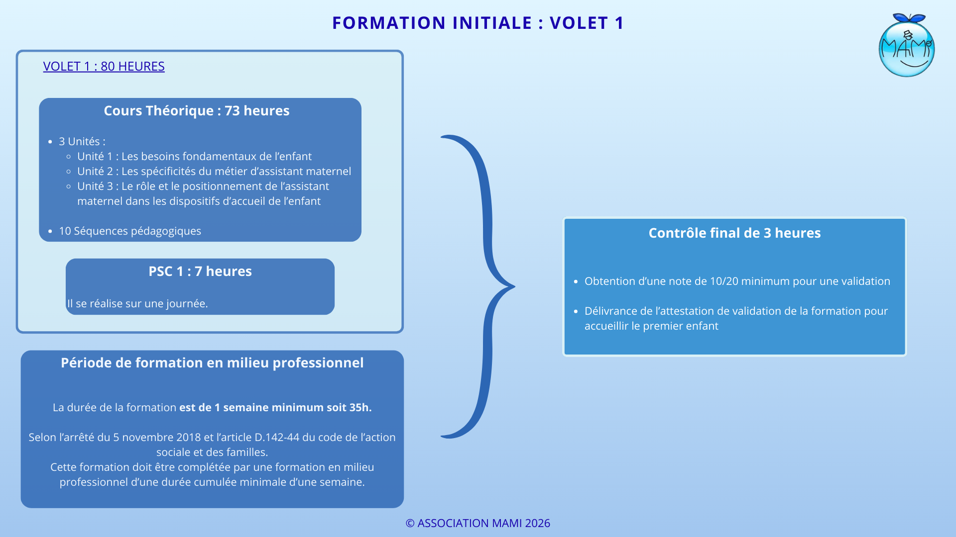 Cette formation prévoit 80 heures de formation préalable (VOLET 1) à l’accueil de l’enfant, suivies de 40 heures de formation complémentaire (VOLET 2) dans un délai maximum de 3 ans à compter de l’accueil du premier enfant par l’assistant(e) maternel(le).